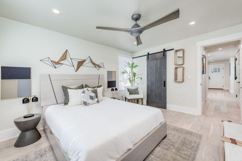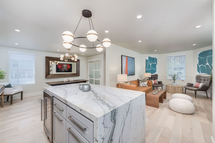 These spectacular 2 bed / 2 bath residences offer an impressive kitchen furnished with top-of-the-line KitchenAid appliances, a wine refrigerator and a waterfall edge island with bar seating. An open floor plan allows great flow from the kitchen to the dining and living room. There is a small hallway with a linen closet that leads to both bedrooms. Both bedrooms have large walk-in closets and the master has an en-suite bathroom featuring a double sink vanity, a marble shower and a large custom mirror. The guest bedroom is large in size with the guest bathroom adjacent in the hallway. The homes have large and private fully landscaped yards with a gas firepits. The apartments have a full size washer / dryer, white oak hardwood floors and are pet friendly.